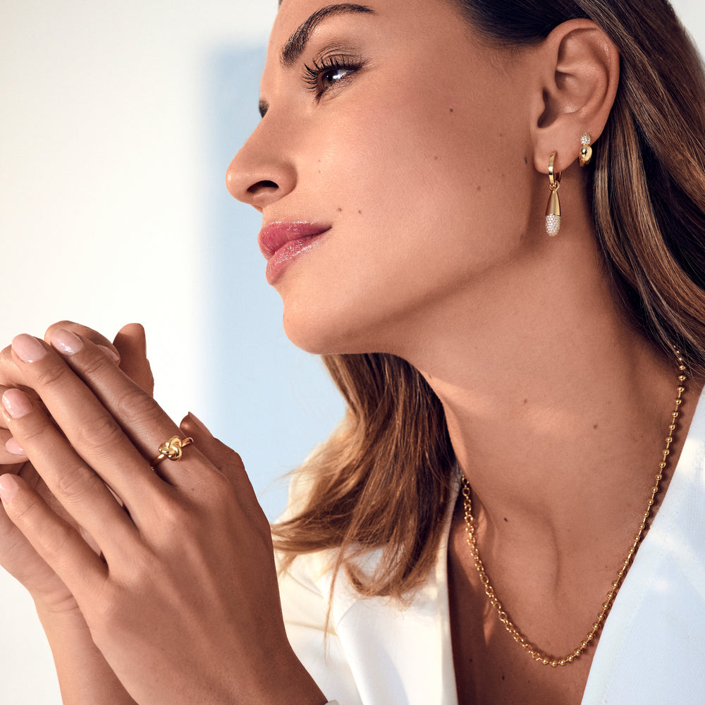 The Goccia Creolo Piccolo earrings embody modern elegance. Crafted from 18k gold plated 925 Sterling Silver with a polished surface, each earring is handset with facet-cut white zirconia that catch the light beautifully, creating a subtle, radiant shine. Their delicate hoop design adds movement and sophistication, making them perfect for elevating everyday outfits or completing a polished look for special occasions. Wear them alone for understated elegance or layer with other favourites for a contemporary, personalized style.